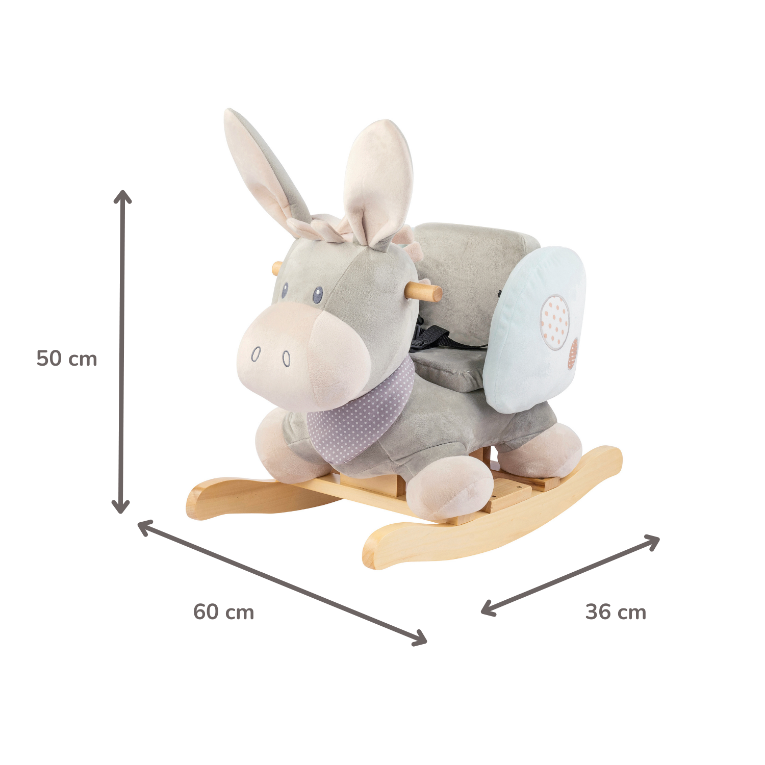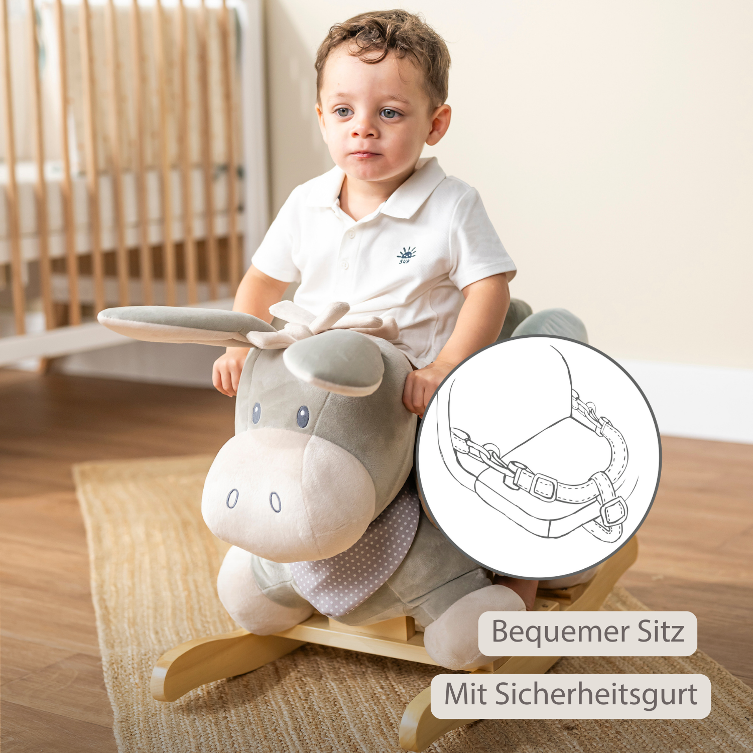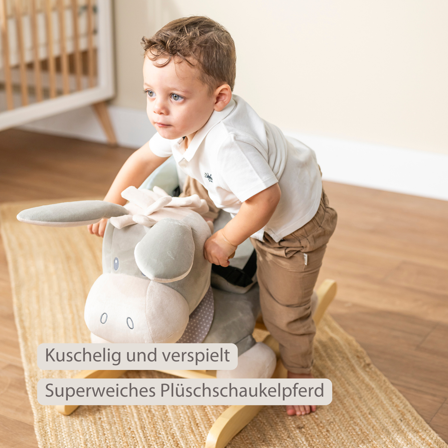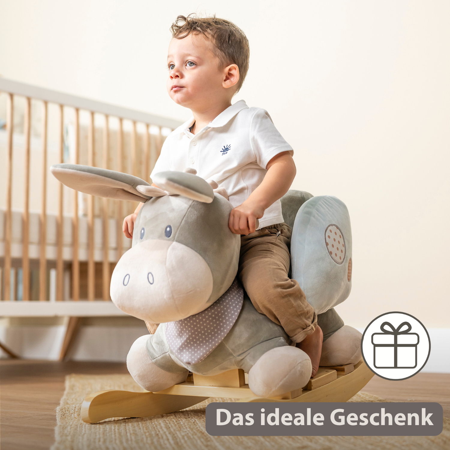 Das Schaukelpferd-Esel in Grau und Blau von Nattou verbindet Sicherheit, Komfort und Spielspaß. Ihr Kind kann auf dem weichen Plüschsitz mit Sicherheitsgurt Platz nehmen und sich an den stabilen Holzgriffen festhalten. Das fröhliche Schaukeln trainiert Gleichgewichtssinn und Motorik, während Ihr Kleines seinen neuen Kuschelfreund genießt. Ein wunderschönes und langlebiges Spielzeug, das stundenlangen Spaß garantiert und ein einzigartiges Babygeschenk für besondere Anlässe darstellt.