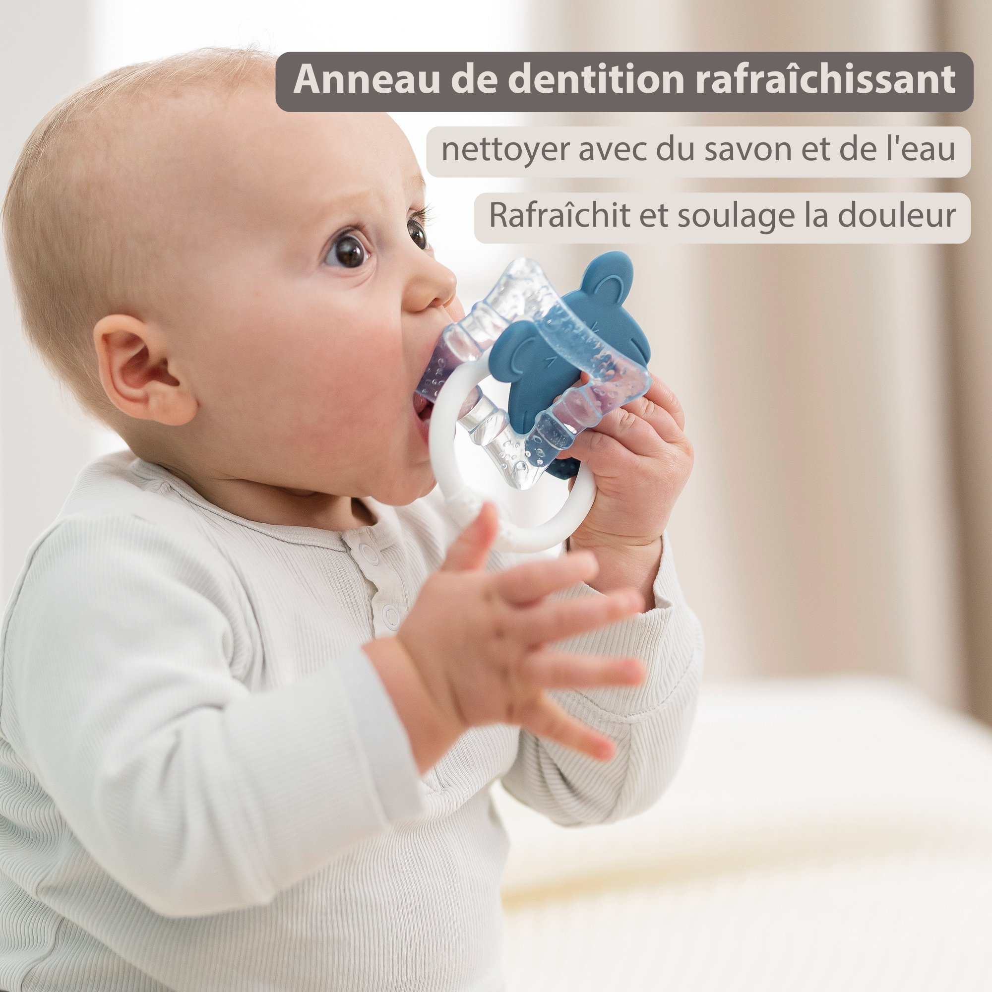 - Anneau de dentition rafraîchissant en silicone doux et sans BPA