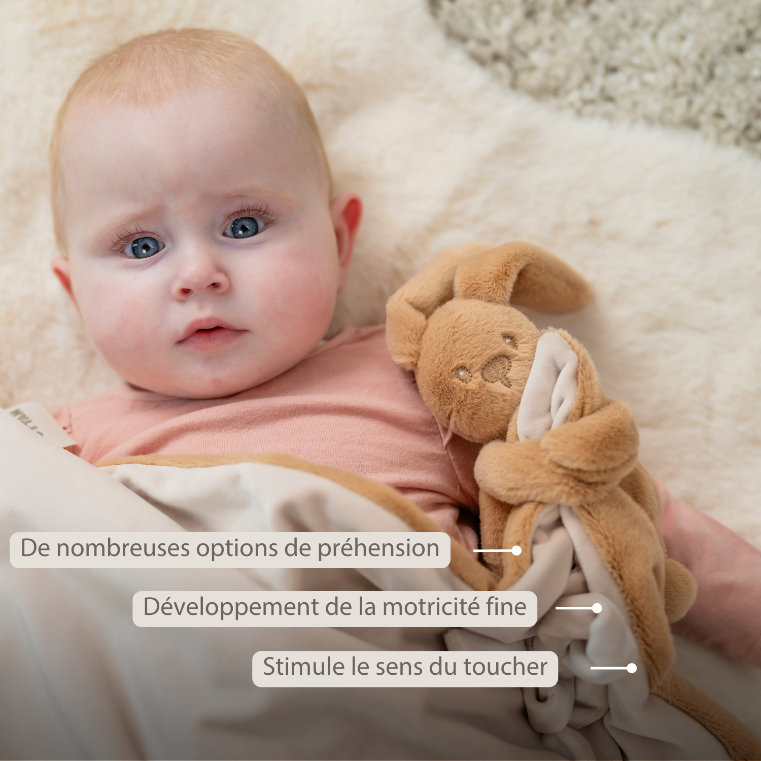 - Idéale pour stimuler le développement tactile ainsi que la motricité globale et fine grâce à un tissu doudou avec différentes textures et possibilités de préhension