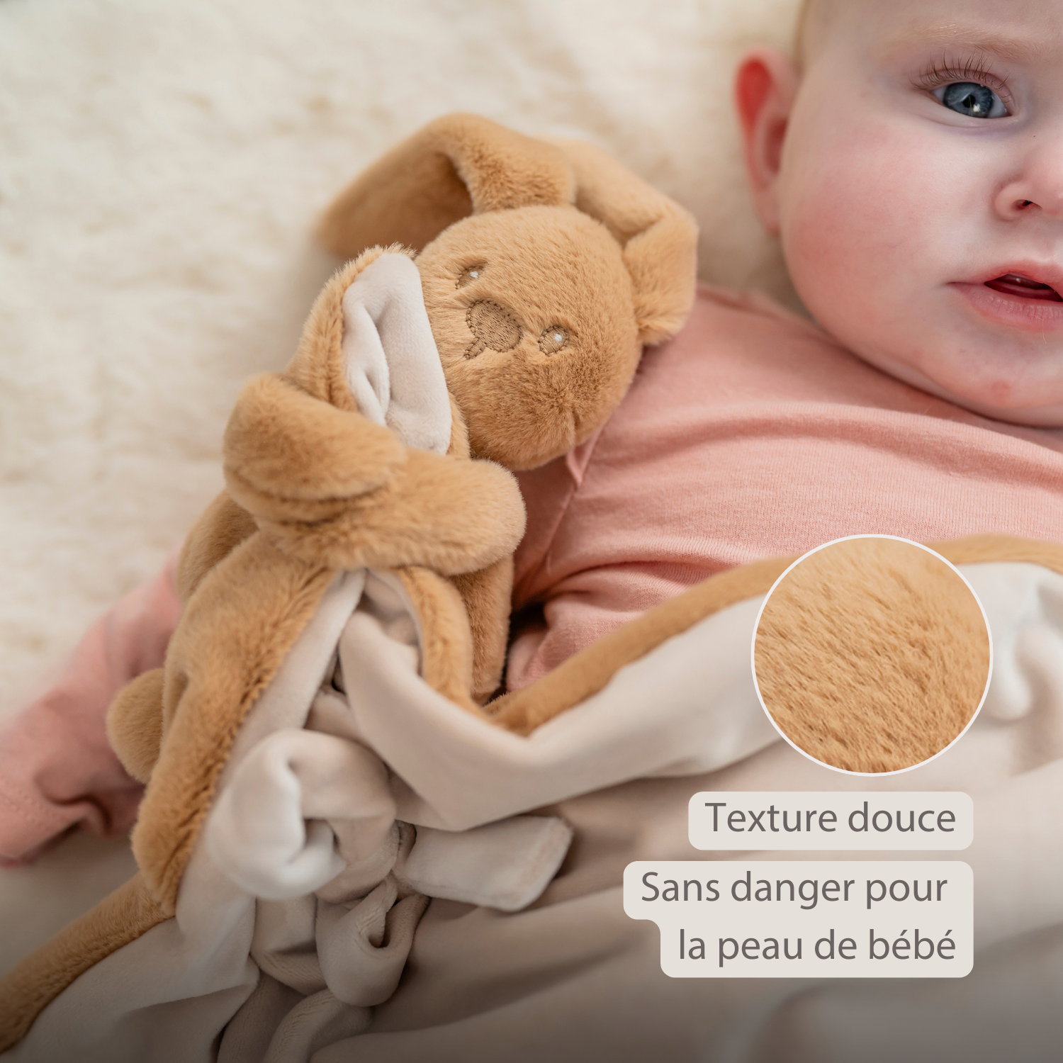 Lapidou Couverture bébé avec peluche – 50 x 50 cm – Lapin doudou – Beige chaud