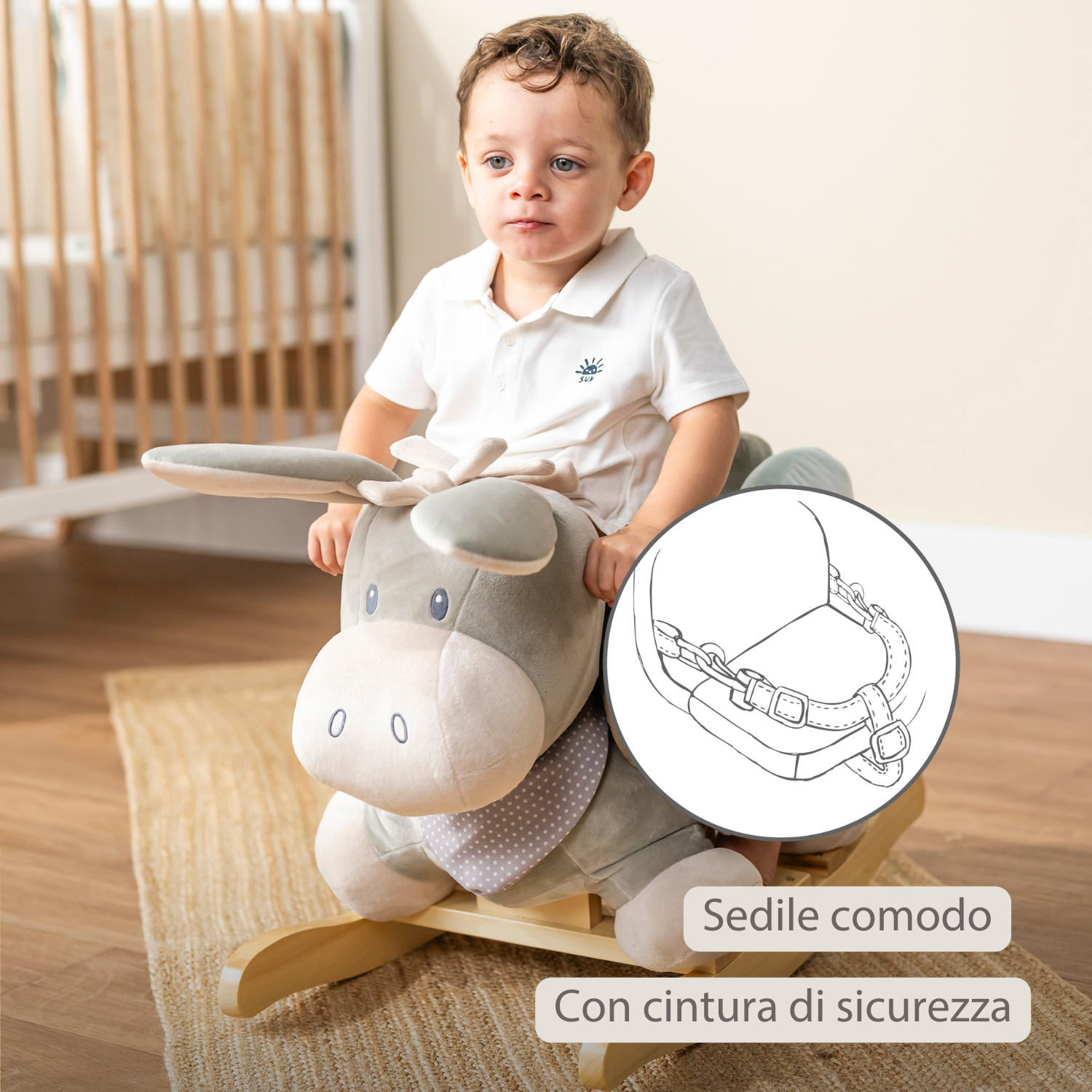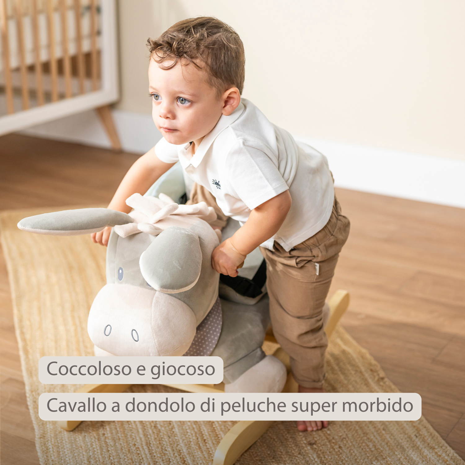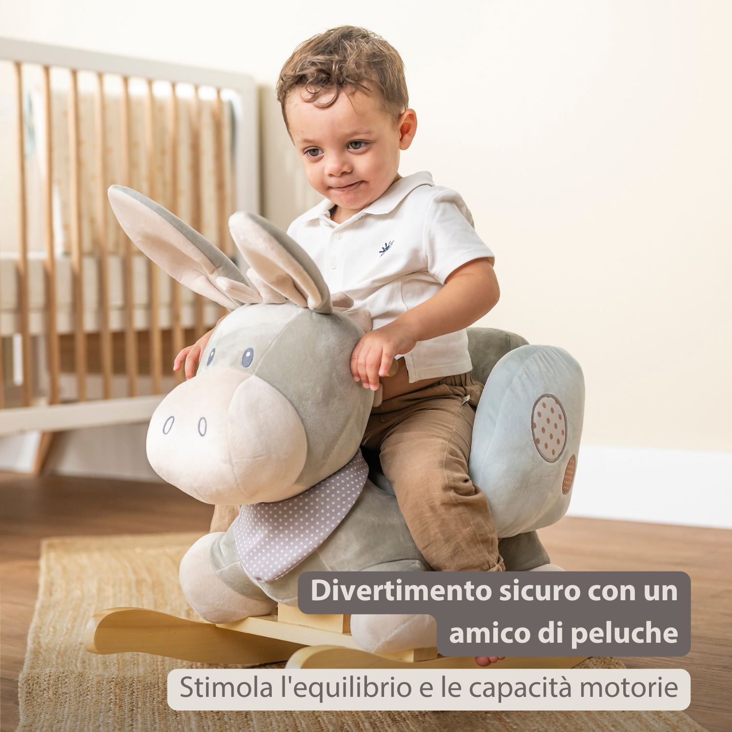Il cavallo a dondolo a forma di asino in grigio e blu di Nattou combina sicurezza, comfort e divertimento. Il tuo bambino può sedersi sul morbido sedile in peluche con cintura di sicurezza e tenersi saldamente alle maniglie in legno. Il dondolio allegro stimola l’equilibrio e la motricità, mentre il tuo piccolo si gode il suo nuovo amico peluche. Un giocattolo bellissimo e durevole, che garantisce ore di divertimento e rappresenta un regalo unico per neonati in occasioni speciali.