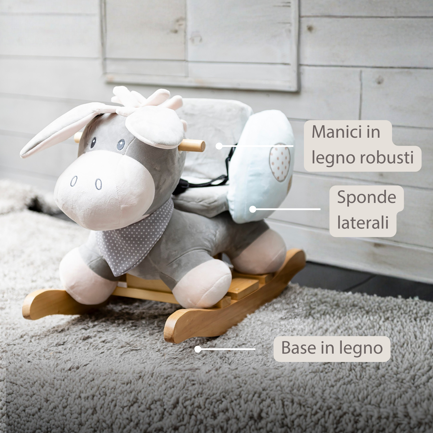 - Materiale: legno + peluche (poliestere)