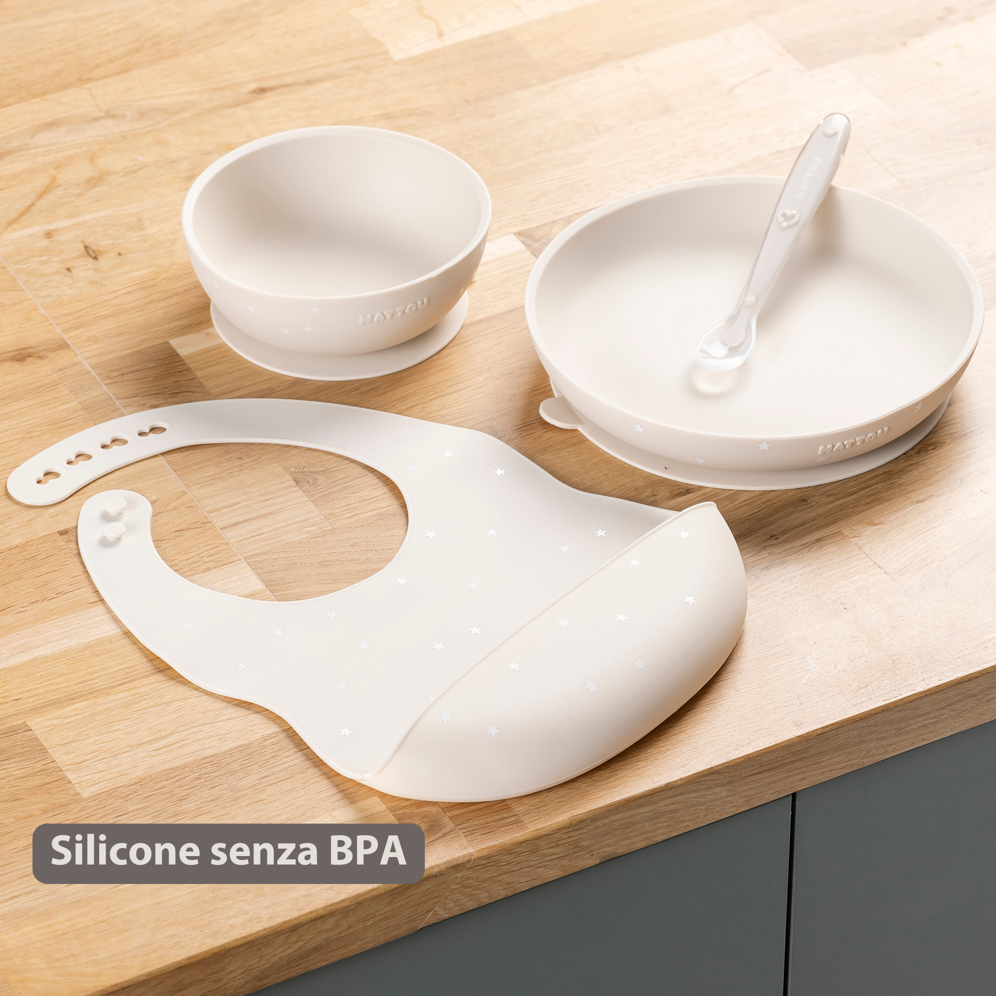 Servizio in silicone – Servizio per bambini – Bavaglino – Set pappa bebè – Argilla con stelle