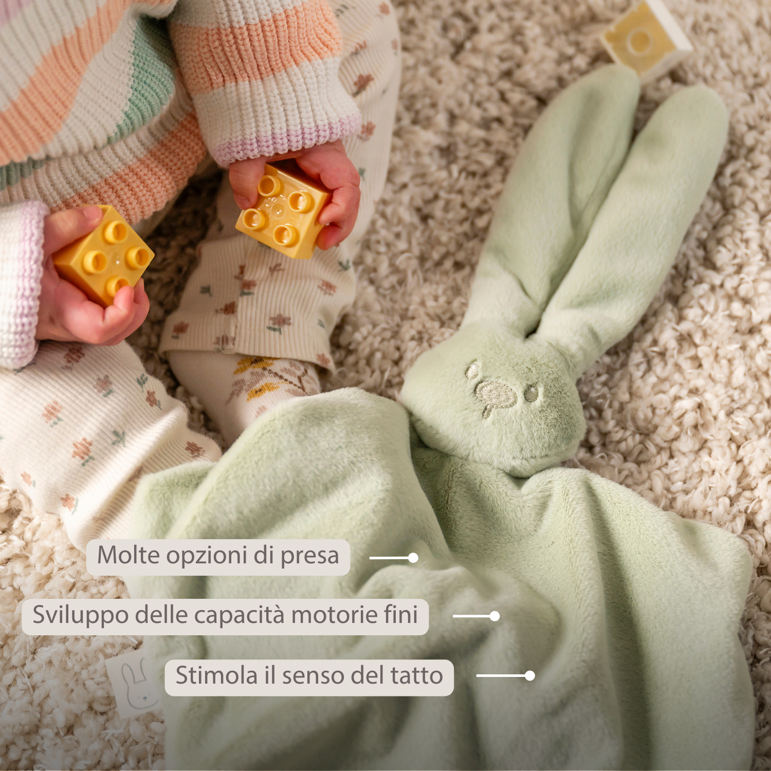 Questa maxi copertina morbida color verde lino di Nattou a forma di dolce coniglietto diventerà fin dalla nascita un amico inseparabile del tuo bambino. La combinazione di materiali soffici in diversi colori risulta piacevolmente coccolosa e dona al tuo piccolo una sensazione di sicurezza e tranquillità. Grazie alle dimensioni generose, alle numerose possibilità di presa e ai dettagli extra come etichette e bottoncini, questa copertina stimola il senso del tatto e la motricità fine delle manine. Il coniglietto offre conforto nei momenti difficili e garantisce serenità durante i viaggi o al momento della nanna. Con i due pratici cordoncini puoi facilmente fissare un ciuccio, così sarà sempre a portata di mano. Un tenero doudou, funzionale e allo stesso tempo un meraviglioso regalo per neonati.