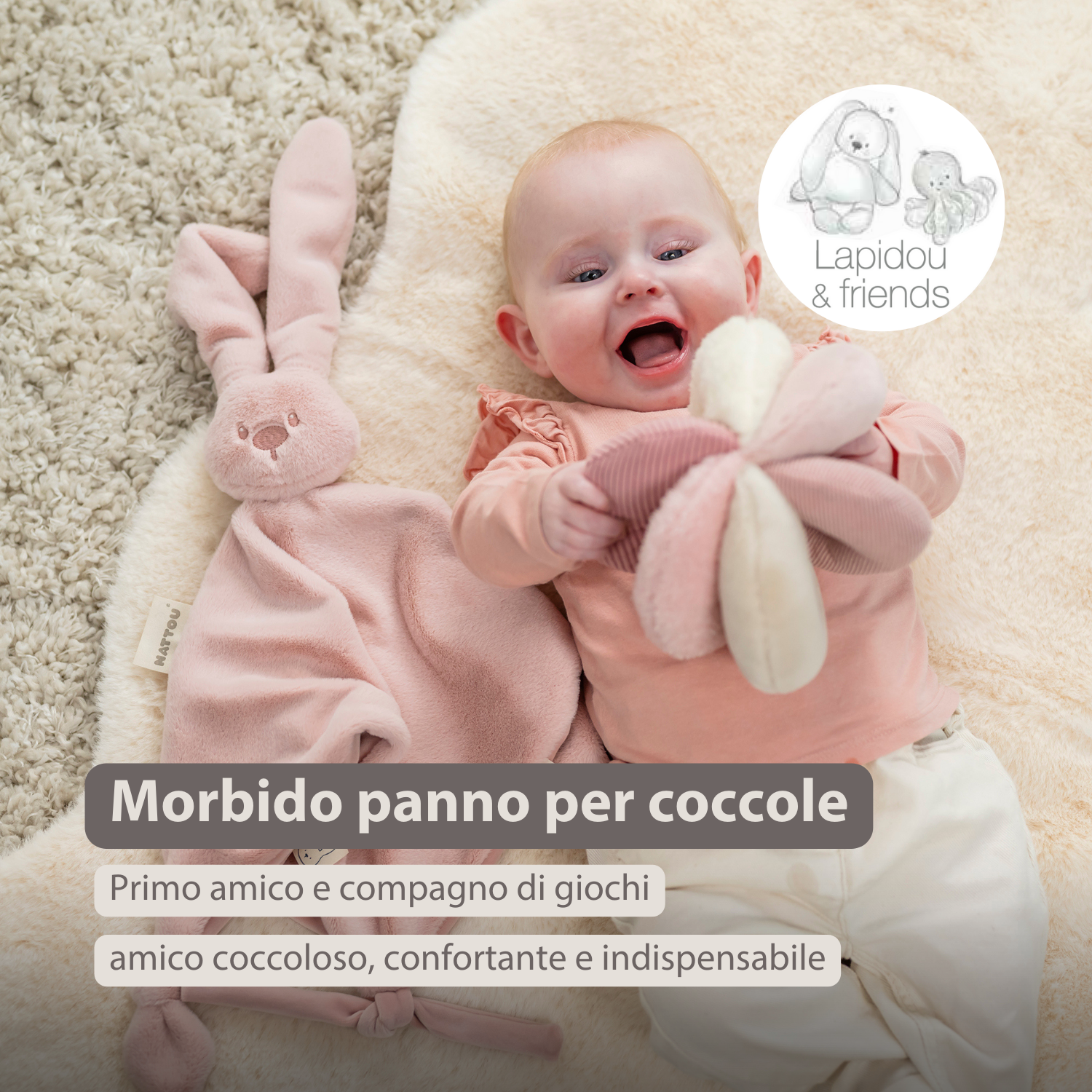 Benvenuti nel mondo dolce e giocoso di Lapidou, una collezione affettuosa di Nattou piena di coniglietti. Questa collezione offre tutto ciò che serve ai più piccoli per sentirsi sicuri e amati. Dai teneri doudou e pupazzi morbidi fino a soffici copertine, ogni articolo porta calore, comfort e allegria. Che tu stia cercando un amico consolatore o una copertina cozy per la culla, Lapidou è perfetto per coccolare, giocare e addormentarsi felici. Porta un tocco di magia e divertimento nelle coccole nella vita quotidiana del tuo bambino con Lapidou, morbido, dolce e sempre pronto per un abbraccio.