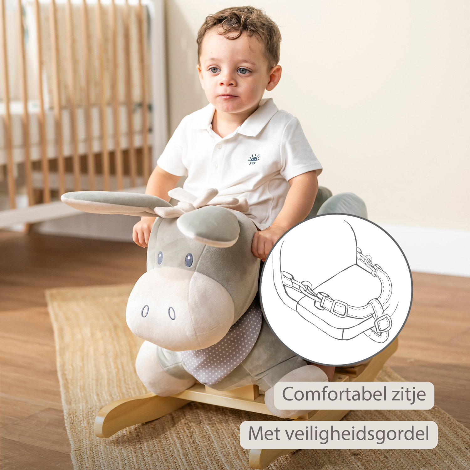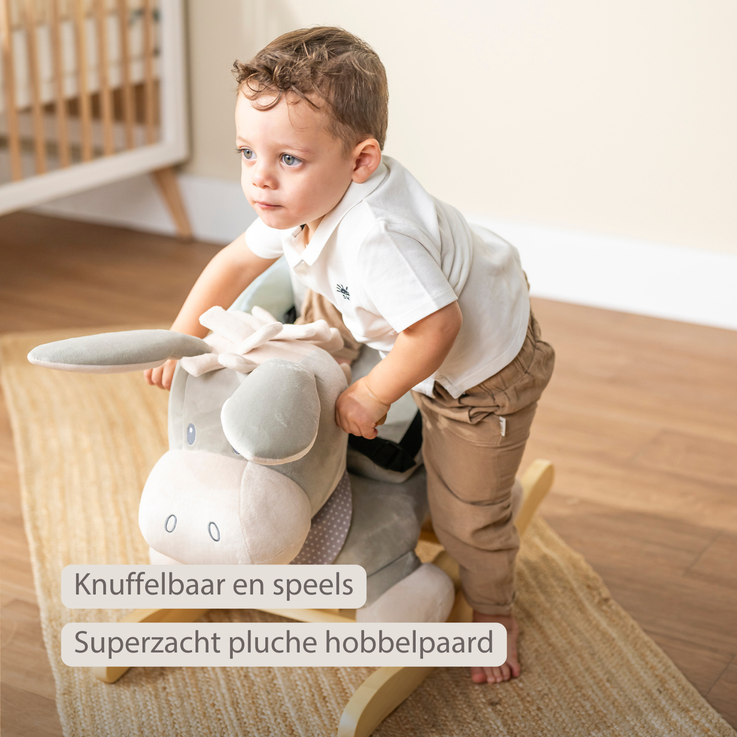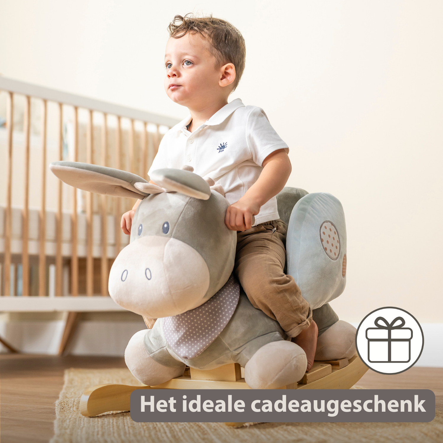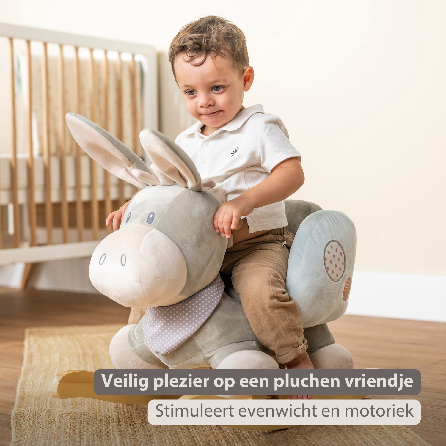 Het schommelpaard ezel in grijs en blauw van Nattou combineert veiligheid, comfort en speelplezier. Je kindje kan plaatsnemen in het zachte pluchen zitje met veiligheidsgordel en zich stevig vasthouden aan de houten handgrepen. Het vrolijke schommelen traint het evenwichtsgevoel en de motoriek, terwijl je kleintje geniet van zijn nieuwe knuffelvriend. Een prachtig en duurzaam speelgoedstuk dat garant staat voor uren plezier en een uniek baby cadeau voor speciale gelegenheden.