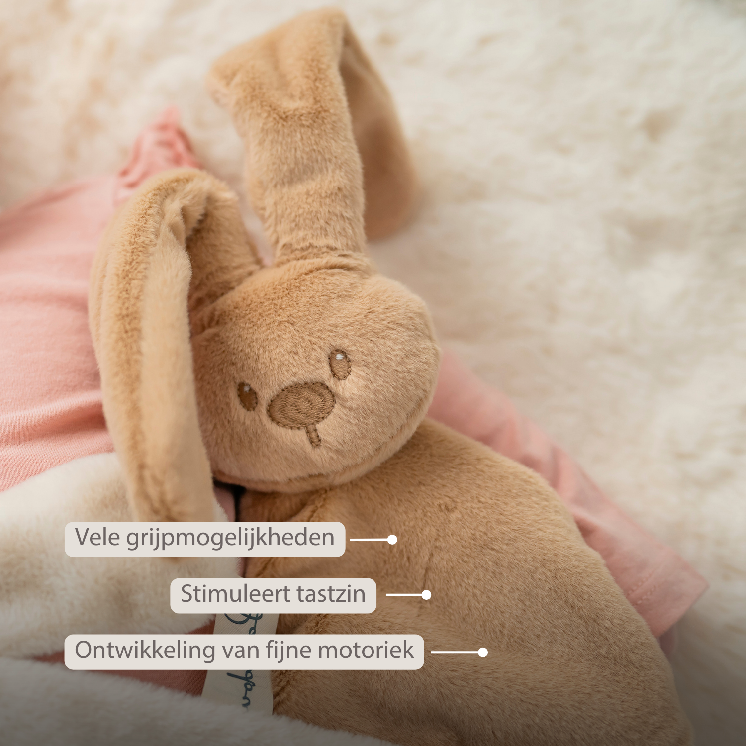 - Verschillende grijpmogelijkheden voor kleine handjes zoals het hoofd met oren, strikjes en etiketten