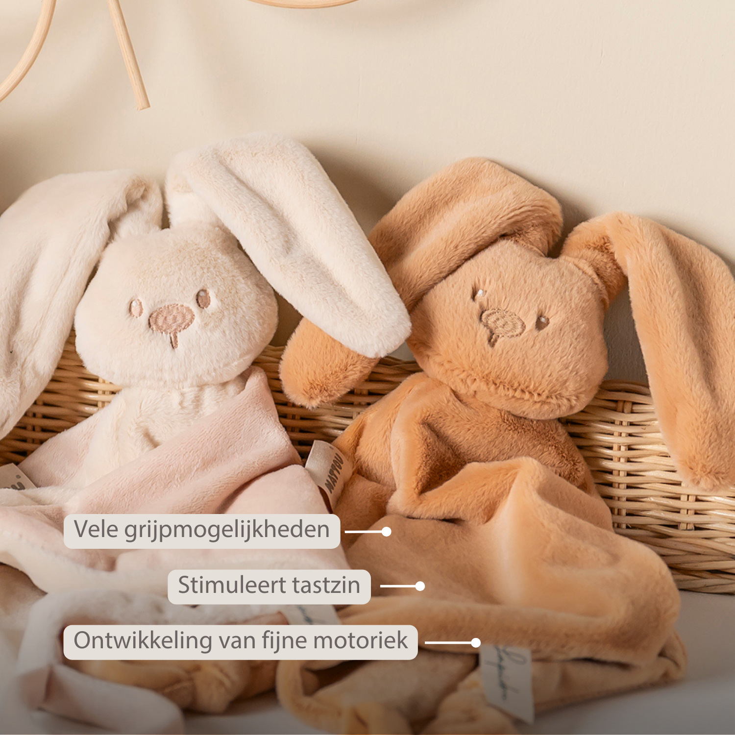 - Verschillende grijpmogelijkheden voor kleine handjes zoals het hoofd met oren, strikjes en etiketten