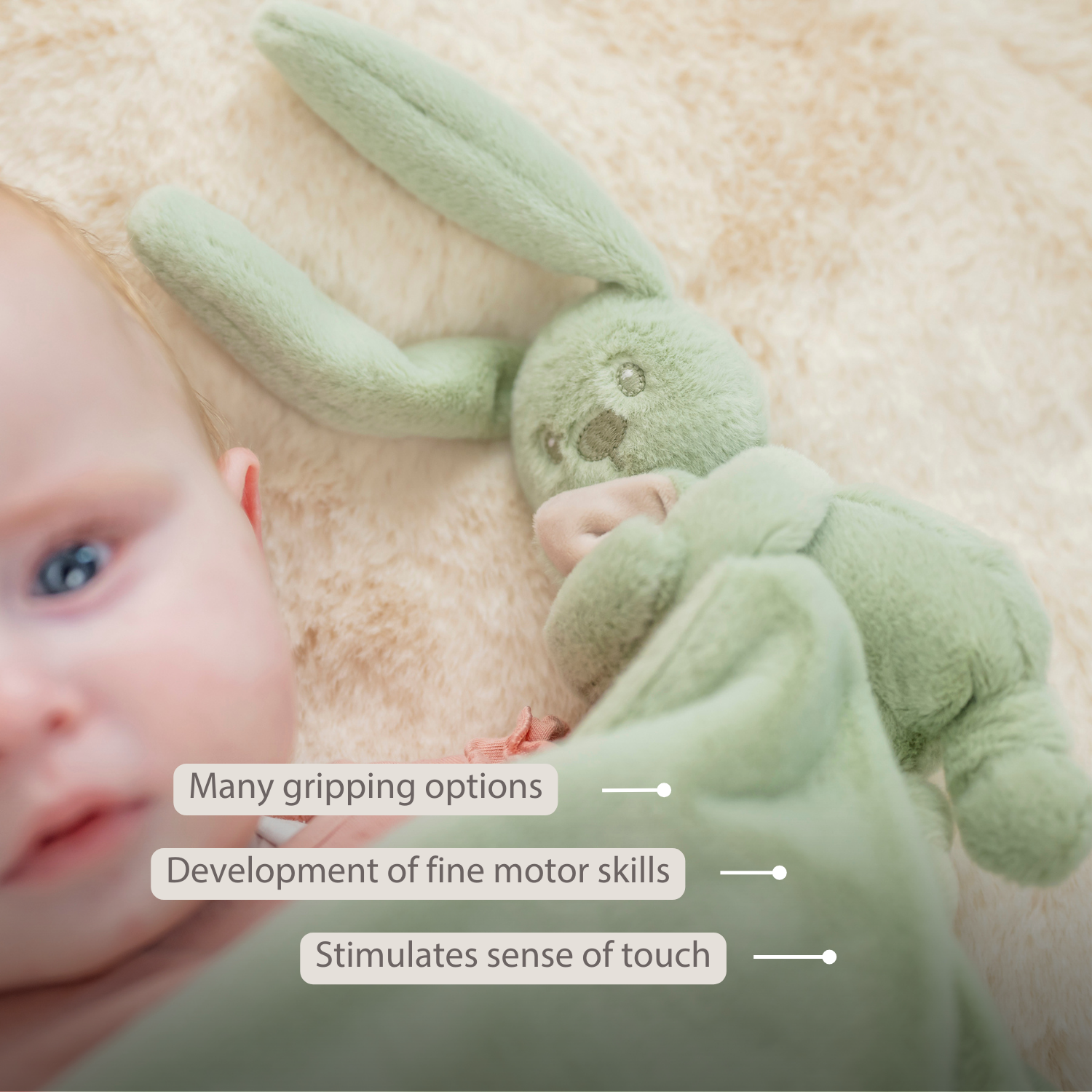 The comforter blanket with a little bunny from Nattou becomes your baby’s inseparable friend from birth. The soft blanket provides a sense of security and comfort, while the bunny gives little hands extra grip. Thanks to its ultra-soft fabric and many gripping possibilities, this cuddly blanket is ideal for newborns and even premature babies. A charming companion that offers both comfort and playful fun, making it a wonderful baby gift for any occasion.