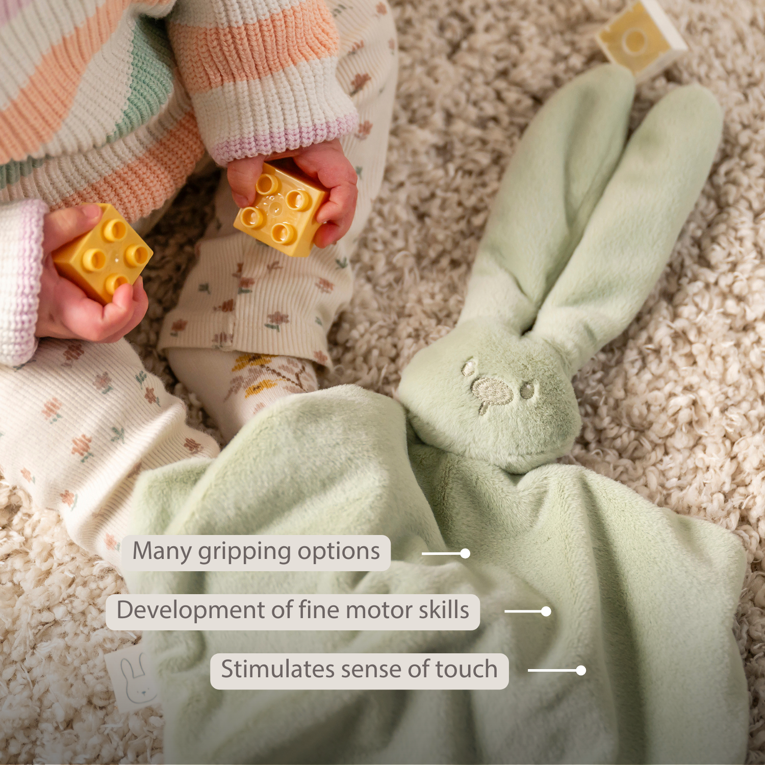 This maxi lime-green comforter from Nattou, shaped like an adorable bunny, becomes your baby’s inseparable friend from birth. The combination of soft materials in different colors feels wonderfully cuddly and gives your baby a sense of security and calm. Thanks to its generous size, multiple gripping possibilities, and extra details such as labels and knots, this comforter stimulates your little one’s sense of touch and fine motor skills. The bunny provides comfort during difficult moments and ensures calm on the go or at bedtime. With the two practical cords, you can easily attach a pacifier so it’s always within reach. A sweet comforter that is both functional and a beautiful baby gift.